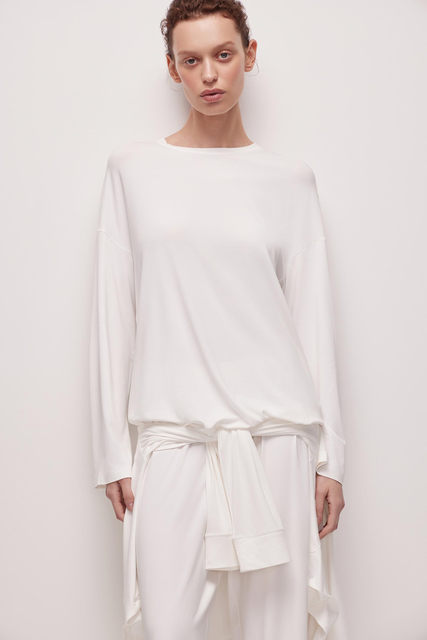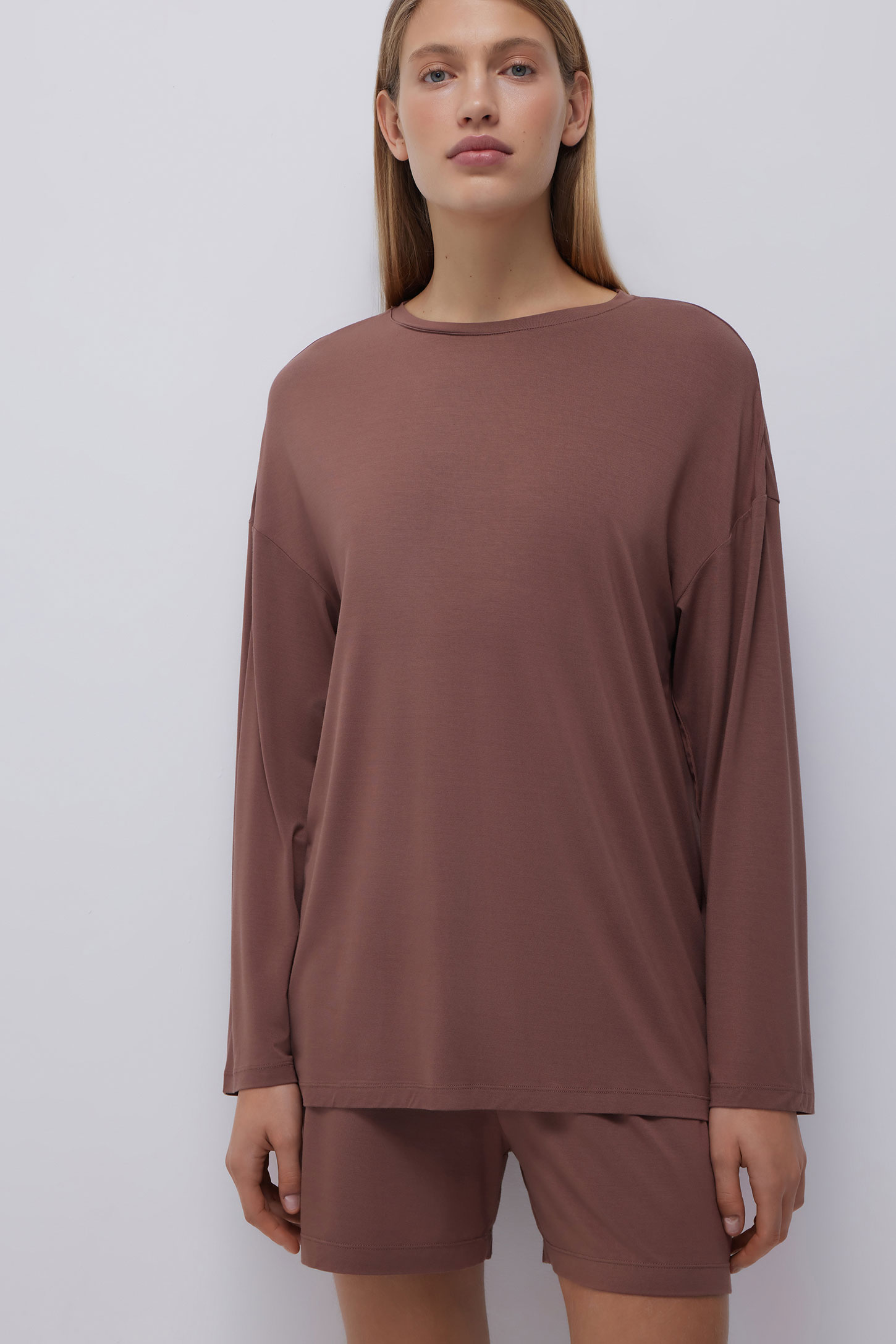 The comfortable long-sleeve is made of a silk-like bamboo knitted fabric. The loose-fitting garment with dropped shoulders features a free-wheeling and easy attitude. Create a cosy lounge look, styling the long-sleeve with wide pants made of a bamboo knitted fabric.
